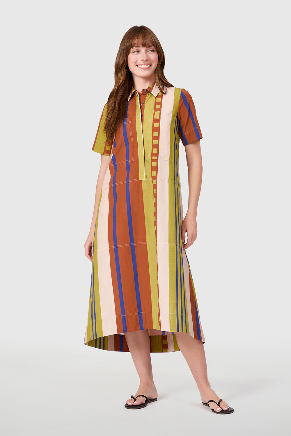 Meet the City Dress — a modern take on the classic shirtdress. Crafted from crisp cotton, this effortless silhouette features a collared neck, short sleeves, and subtle seaming that adds interest. The relaxed A-line shape and high-low hem make it perfect for easy days on the go. Polished yet unfussy, it’s your new everyday essential.