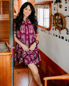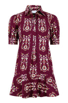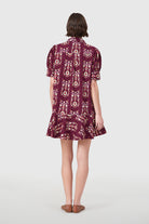 The Liv Dress is a playful mini dress with a tailored bodice and a relaxed drop-waist silhouette. It features short puff sleeves with cuff detailing, a classic shirt collar, and a partial button placket down the front. The skirt is finished with a flounced hem for a feminine, swingy shape.