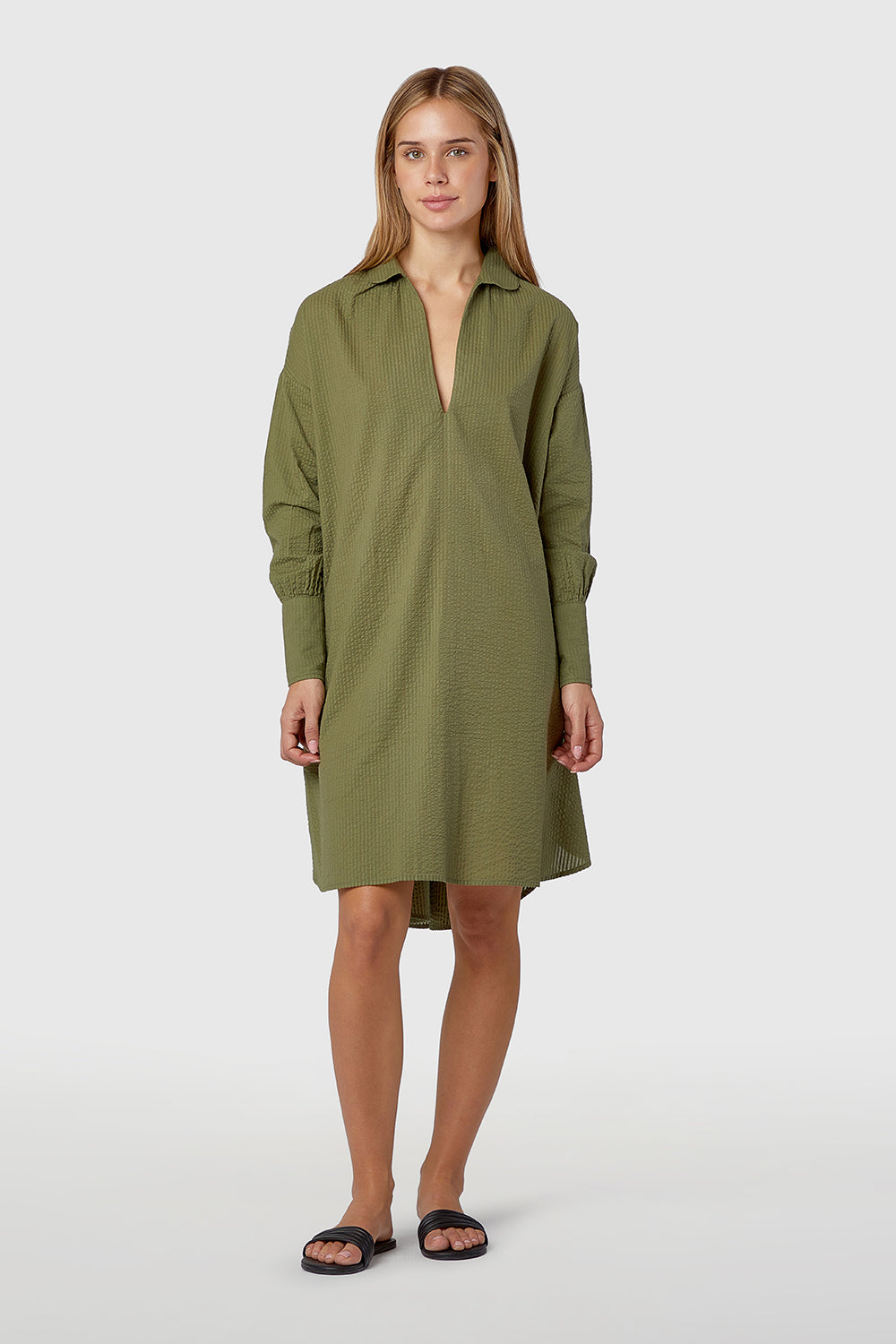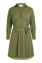 The dress version of our best selling Jane top! The Jane dress features a flattering v-neck, standing collar, and an overall relaxed fit. She has a sash belt that can be removed for easy styling!