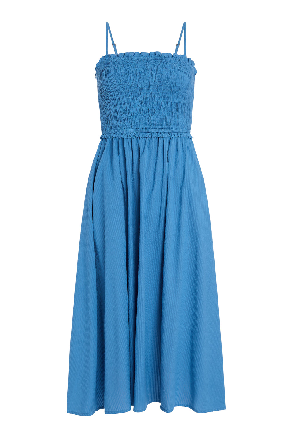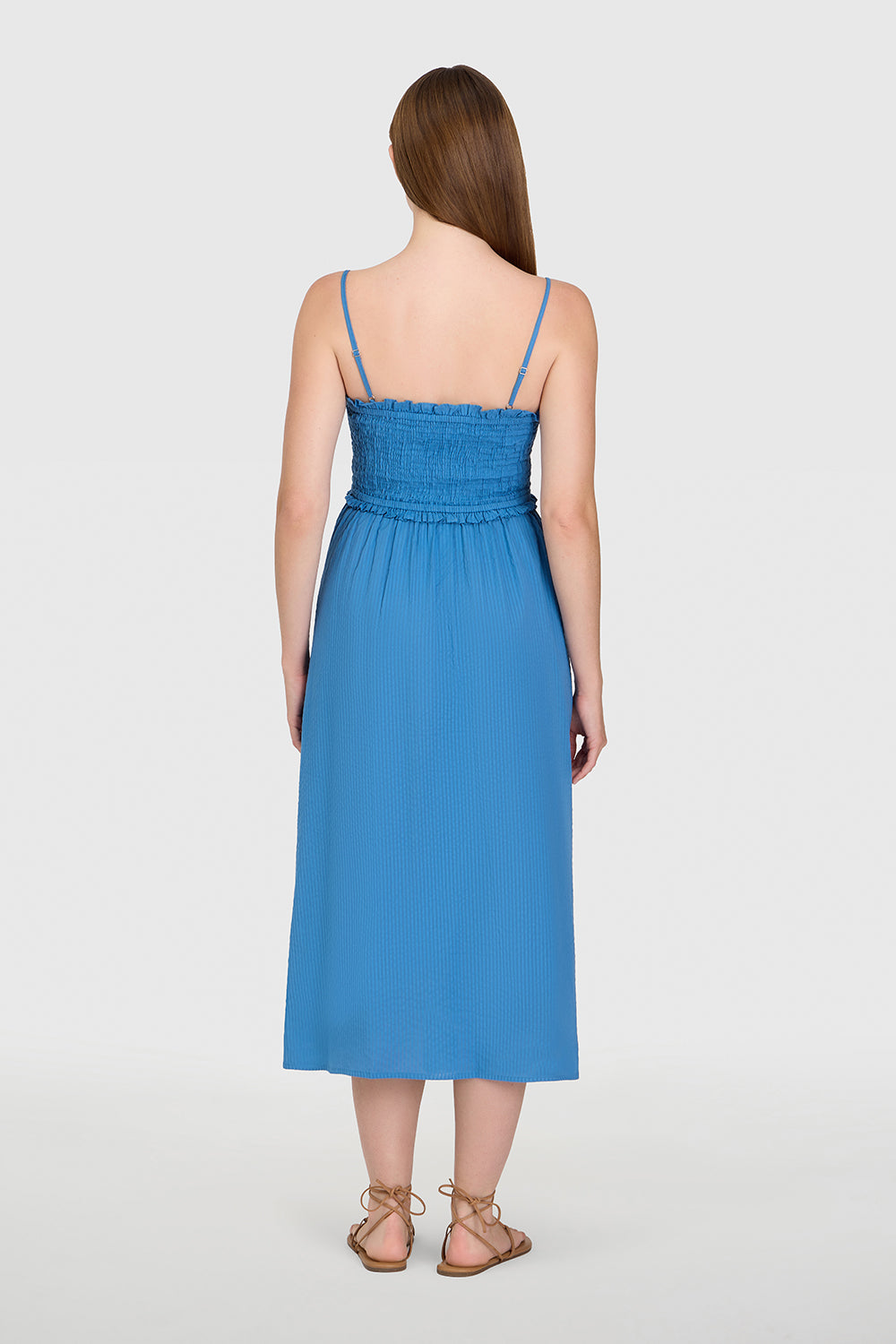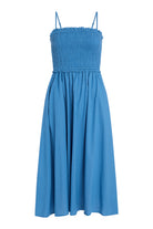 The Smocked Dress features a breezy, feminine silhouette with a smocked bodice and flowy A-line skirt. Designed with delicate, adjustable spaghetti straps, it offers a flattering, form-fitting top that gives way to a relaxed, mid-length skirt. The structured smocking enhances comfort and shape, while the lightweight fabric allows for effortless movement. It's the perfect warm-weather staple—easy to wear, packable for travel, and chic from day to night.