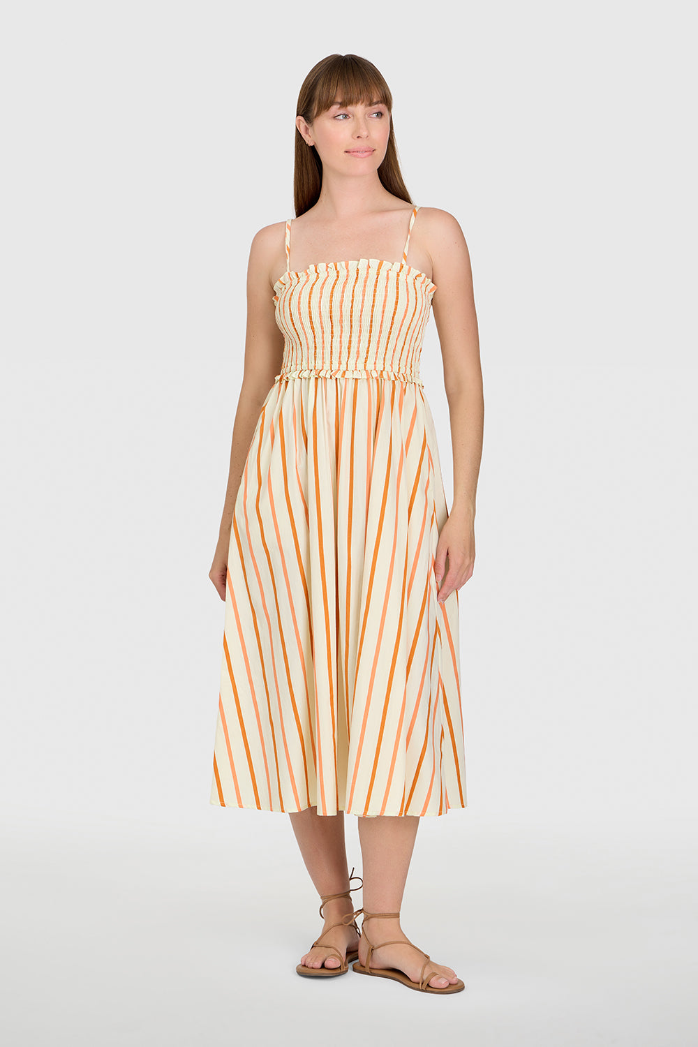 The Smocked Dress features a breezy, feminine silhouette with a smocked bodice and flowy A-line skirt. Designed with delicate, adjustable spaghetti straps, it offers a flattering, form-fitting top that gives way to a relaxed, mid-length skirt. The structured smocking enhances comfort and shape, while the lightweight fabric allows for effortless movement. It's the perfect warm-weather staple—easy to wear, packable for travel, and chic from day to night.