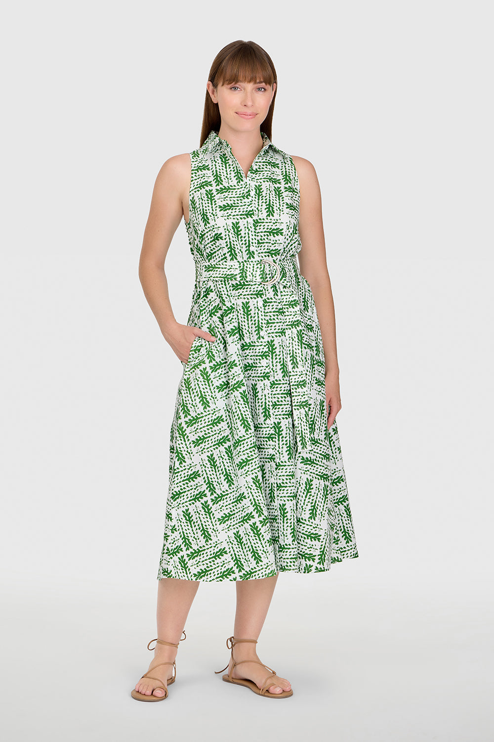 The Field Dress is a sleeveless, midi-length shirtdress with a tailored yet easygoing silhouette. It features a classic collar, full button-front closure, and a removable self-tie belt that cinches the waist for a flattering fit. Designed with subtle pleating at the waist for added movement and structure. Perfect for your spring outings, you can style the dress with flats or heels going from day to night!