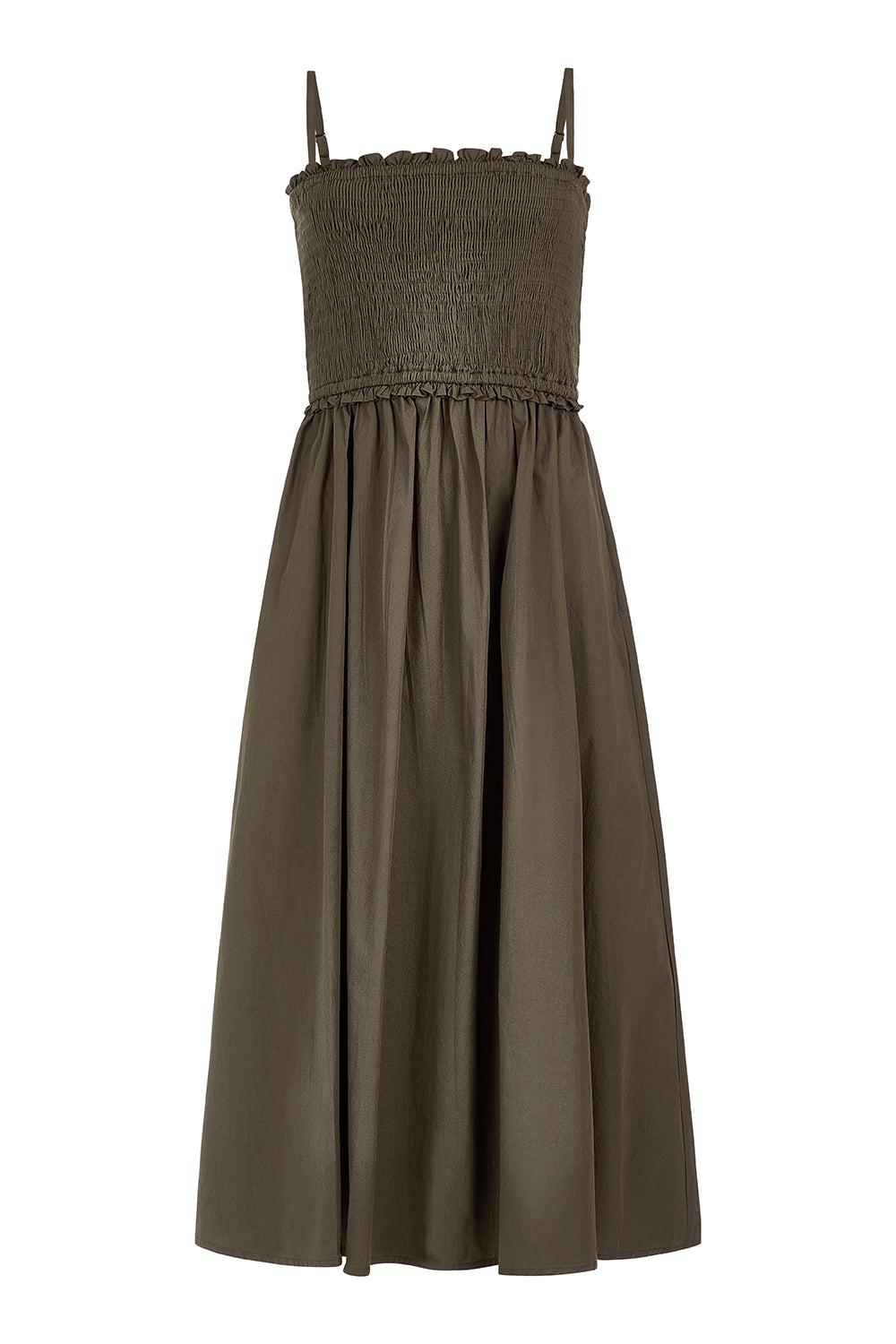 The Smocked Dress features a breezy, feminine silhouette with a smocked bodice and flowy A-line skirt. Designed with delicate, adjustable spaghetti straps, it offers a flattering, form-fitting top that gives way to a relaxed, mid-length skirt. The structured smocking enhances comfort and shape, while the lightweight fabric allows for effortless movement. It's the perfect warm-weather staple—easy to wear, packable for travel, and chic from day to night.